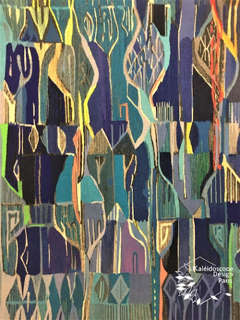 シノヴ・アンカー・オールダルのタピストリーは、そのモチーフのベースとなるデッサンが最高で、彼女は画家としても相当なものだったのではないかと思います。でも特にずば抜けているのは、その色使い !!! 正に魔法をかけられたように色が踊っています。私は特に彼女のブルーが好きだったのですが、中でも下写真の作品にはしばしうっとりとして動けなくなりました。タイトルはズバリ Dream of the blue 。1991年、彼女が83才(オー!!)の時の大作です